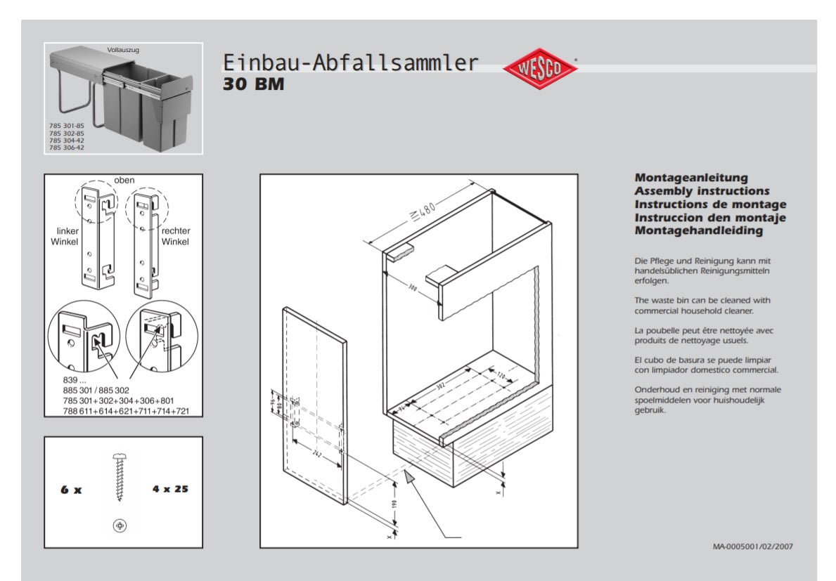The Wesco Double Waste Bin – 30L is designed to fit under sink units door mounted. The 1 x 20L 1 x 10L kitchen bin compartments hang from a floor mounted frame. Fix the frame to the base of your cupboard and the door frame to the front frame of the kitchen bin- the rubbish bins pull out on full extension ball bearing runners.